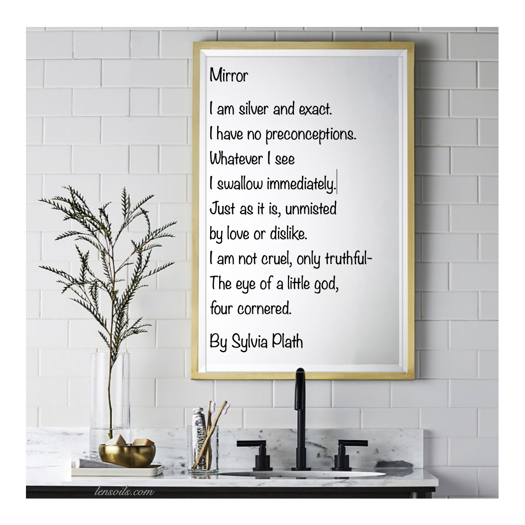 Mirror December 30, 2023PoemDid you know guy, Exact, Four Cornered, little god, Love or dislike, No Preconceptions, Not Cruel, Silver, Swallow, Sylvia Plath, The did you know guy, Truthful, Unmistedlfish64 Mirror I am silver and exact. I have no preconceptions.Whatever I see I swallow immediatelyJust as it is, unmisted by love or dislike.I am not cruel, only truthful-The eye of a little god, four cornered. By Sylvia PlathShare this: Email a link to a friend (Opens in new window) Email Share on X (Opens in new window) X Share on Facebook (Opens in new window) Facebook Share on StumbleUpon (Opens in new window) StumbleUpon Share on Reddit (Opens in new window) Reddit Share on LinkedIn (Opens in new window) LinkedIn Share on Pinterest (Opens in new window) Pinterest Share on Tumblr (Opens in new window) Tumblr Like Loading...
