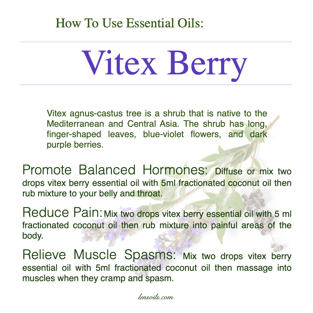 How to Use Essential Oils: Vitex Berry August 1, 2024Better Living, Essential Oil InformationBalanced Hormones, Did you know guy, Essential Oils, Muscle Spasms, Reduce pain, The did you know guy, Vitex Berrylfish64 The Vitex agnus-castus tree is a type of shrub that originally comes from the Mediterranean and Central Asia. This shrub has long, finger-like leaves, blue-violet flowers, and dark purple berries. Share this: Click to email a link to a friend (Opens in new window) Email Click to share on X (Opens in new window) X Click to share on Facebook (Opens in new window) Facebook Click to share on StumbleUpon (Opens in new window) StumbleUpon Click to share on Reddit (Opens in new window) Reddit Click to share on LinkedIn (Opens in new window) LinkedIn Click to share on Pinterest (Opens in new window) Pinterest Click to share on Tumblr (Opens in new window) Tumblr Like Loading...