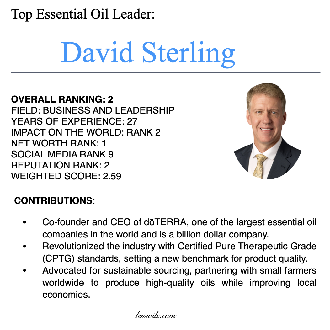 David Stirling, co-founder of dōTERRA is a visionary leader whose work has revolutionized the essential oils industry. Born in 1962, Stirling’s career began in business and product development, where he honed his skills in creating effective systems for quality assurance and sustainable growth. His background in health and wellness industries laid a strong foundation for his later contributions to the essential oils market.