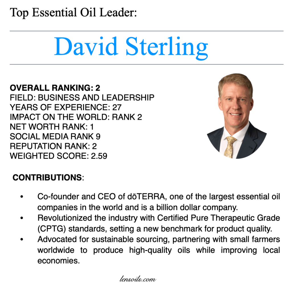 Stirling’s leadership has taken essential oils from niche products to mainstream wellness tools. He has driven widespread consumer education about the benefits of essential oils, integrating them into homes, healthcare systems, and wellness practices worldwide. His focus on research has also contributed to the growing body of scientific evidence supporting the therapeutic uses of essential oils, bridging the gap between natural remedies and modern medicine.