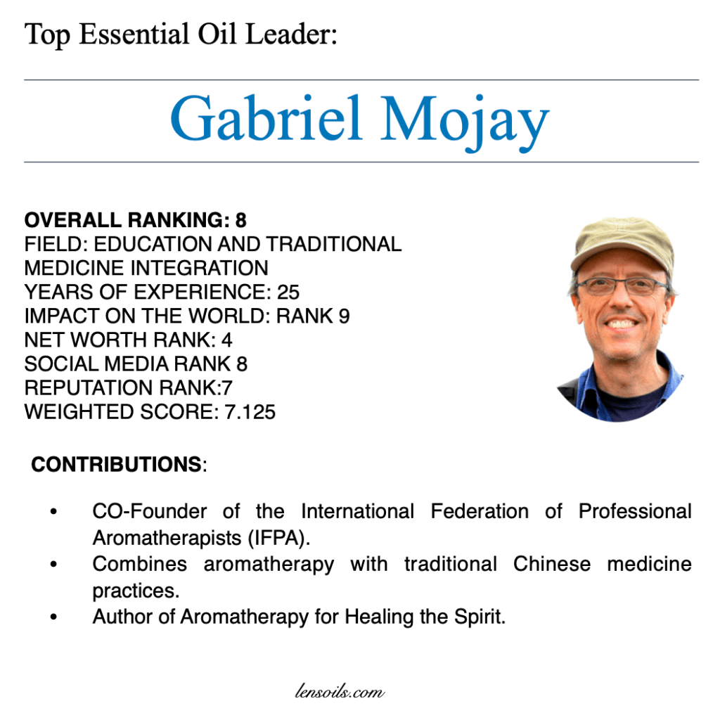 Gabriel Mojay is a highly respected educator, author, and practitioner in the field of aromatherapy and traditional medicine. He is best known for integrating aromatherapy with traditional Chinese medicine (TCM), offering a unique approach to holistic healing that considers both the physical and emotional well-being of individuals. His work has helped bridge the gap between Eastern and Western healing traditions, bringing greater depth to the practice of essential oil therapy. Through his research, writing, and teaching, Mojay has significantly influenced the development of professional aromatherapy standards worldwide.
