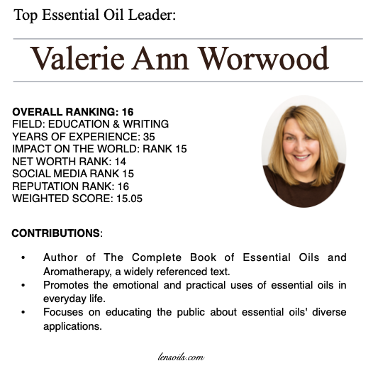 Valerie Ann Worwood is an internationally recognized authority on aromatherapy and essential oils. She is best known as the author of The Complete Book of Essential Oils and Aromatherapy, first published in 1991, which has become one of the most widely referenced texts in the field. Her work is often described as both practical and comprehensive, making it accessible for beginners while still offering depth for experienced practitioners. Over the years, her books have been translated into multiple languages and have helped spread knowledge of aromatherapy to a worldwide audience.