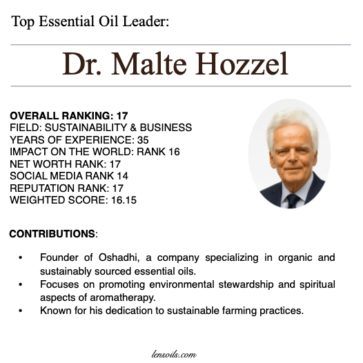 Dr. Malte Hozzel is the founder of Oshadhi, a company established in 1990 that has become internationally recognized for providing high-quality essential oils and aromatherapy products. From its beginnings in Germany, Oshadhi has grown into a respected global brand, distributing oils sourced from around the world. With more than three decades of leadership in the industry, Malte has positioned Oshadhi as a pioneer in combining traditional knowledge with modern understanding of plant-based wellness. His work has helped set standards for purity, authenticity, and responsible sourcing within the essential oil field.