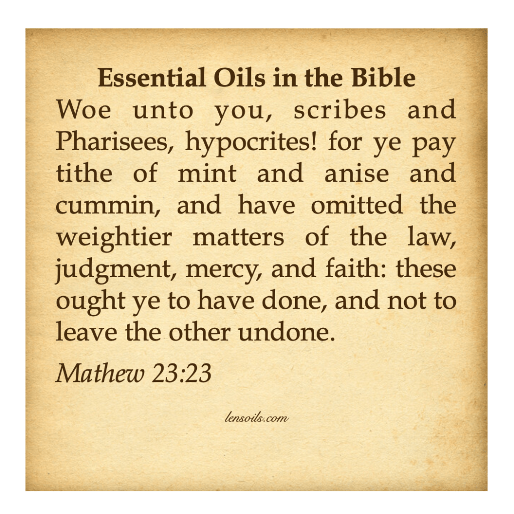 The specific mention of mint, anise, and cumin reflects how far this attention to detail had gone. These were common garden spices, inexpensive and small, yet the Pharisees meticulously counted and tithed them to demonstrate obedience. While this practice was not wrong in itself, Jesus pointed out that their focus on minor regulations had come at the expense of far more important responsibilities—justice toward others, mercy for those in need, and faithfulness of heart. In other words, they were keeping the letter of the law while neglecting its spirit.
