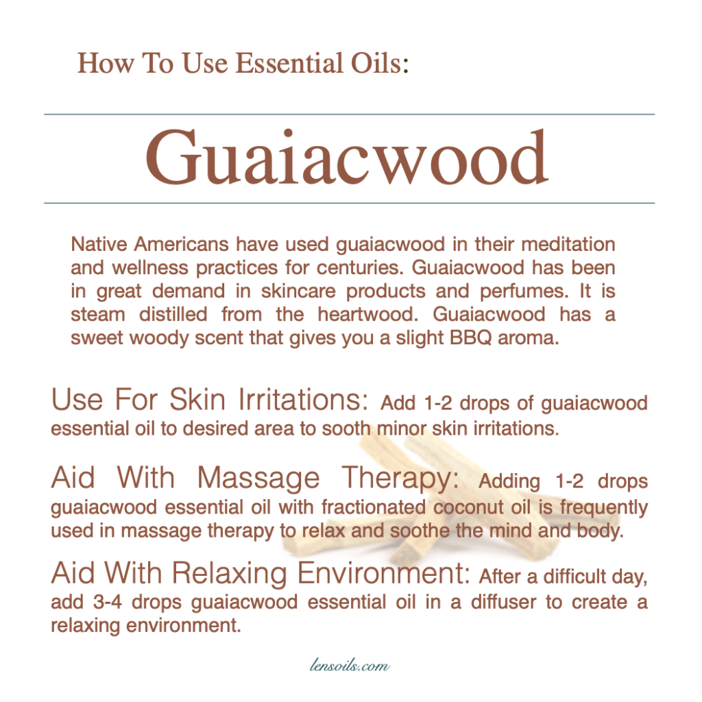 In everyday use, guaiacwood essential oil is often chosen for its soothing qualities. When diluted and applied topically, it may help calm minor skin irritations. Blended with fractionated coconut oil, it is frequently used in massage therapy to promote relaxation of both the mind and body. Diffusing three to four drops after a long or stressful day can help create a calm, peaceful environment, making guaiacwood a comforting oil for winding down and restoring balance.