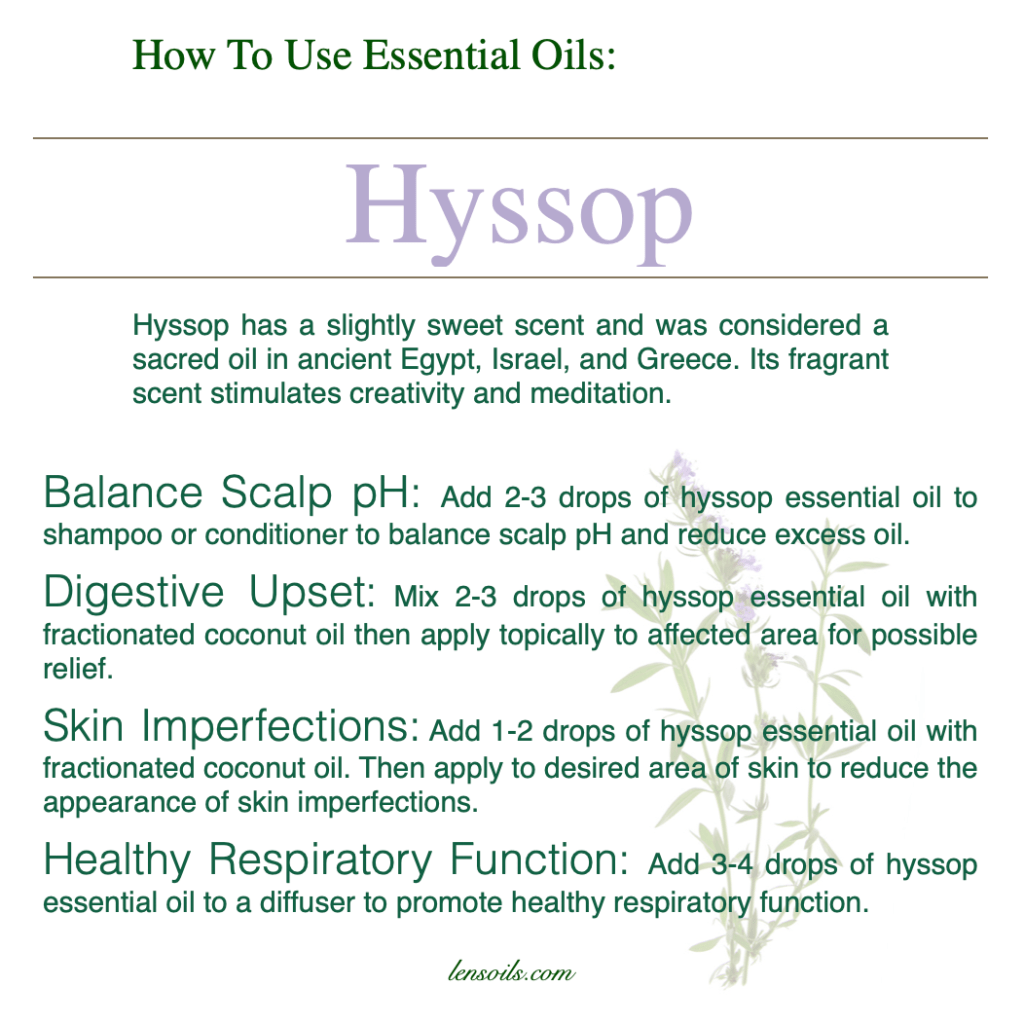 In everyday wellness routines, hyssop essential oil offers gentle, versatile support. It can be added to hair care products to help balance the scalp, blended with a carrier oil for targeted skin or digestive comfort, or diffused to support clear breathing and a refreshed environment. Many people appreciate hyssop for its ability to feel both uplifting and steady, making it a thoughtful choice when balance and clarity are needed.