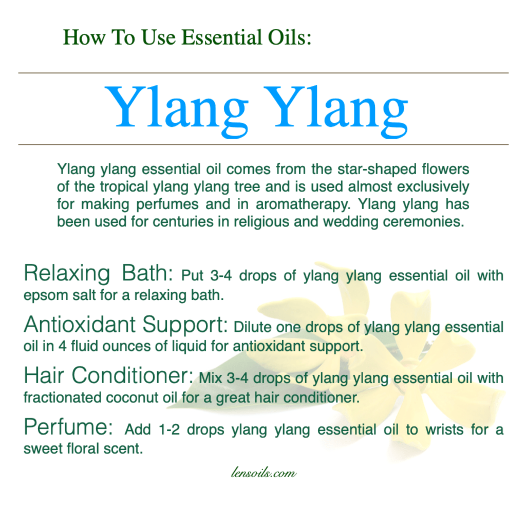 Ylang ylang essential oil is made from the star-shaped flowers of the tropical ylang ylang tree. It’s mostly used for making perfumes and in aromatherapy. For centuries, ylang ylang has been part of religious rituals and wedding ceremonies.