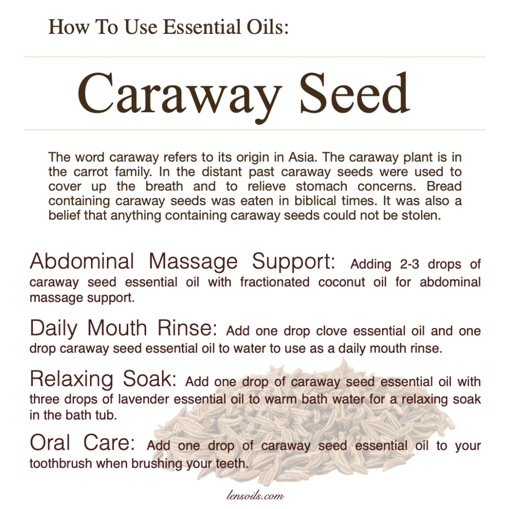 Today, caraway seed essential oil is widely used for digestive and oral health benefits. It is often blended with fractionated coconut oil for abdominal massage support, as 2-3 drops may help with occasional stomach discomfort. Caraway seed oil is also used for oral care, with many people adding a drop to their toothbrush or a daily mouth rinse to support fresh breath and dental hygiene. A combination of caraway seed and clove essential oil is sometimes used as a natural cleansing rinse, but while caraway oil has antimicrobial properties, more scientific research is needed to confirm its effectiveness in preventing cavities or gum disease.