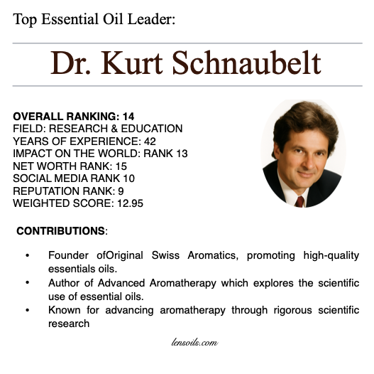 Dr. Kurt Schnaubelt is a chemist with a Ph.D. from the Technical University of Munich in Germany. His scientific training provided a strong foundation for his later work in the field of aromatherapy, where he combined chemistry with natural wellness practices. This background allowed him to examine essential oils not only as natural remedies but also through the lens of chemical composition and their potential therapeutic effects.