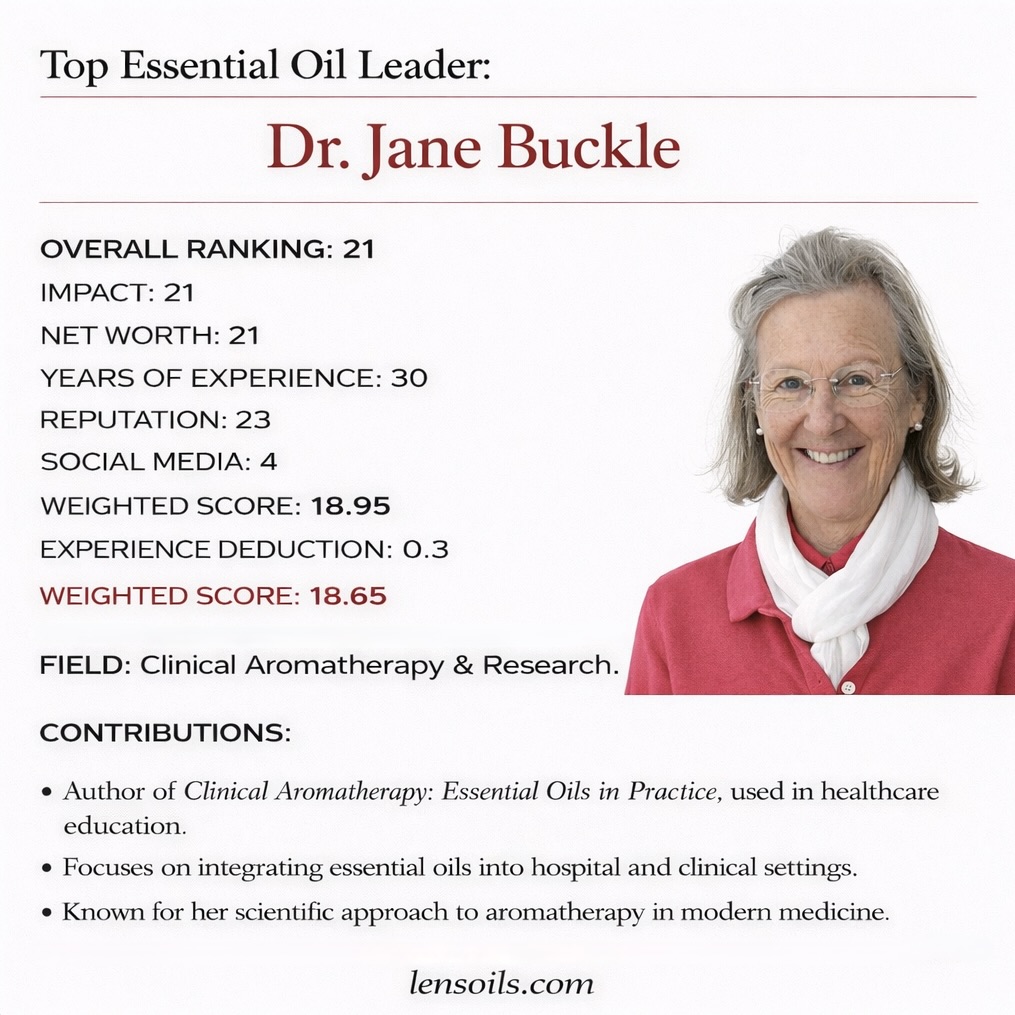 Jane Buckle is widely recognized as a pioneering figure in clinical aromatherapy, particularly for her work bridging essential oils with modern healthcare practice. With more than 30 years of experience, she has played a key role in establishing aromatherapy as a credible complementary approach within medical and clinical environments, emphasizing evidence, safety, and professional accountability.