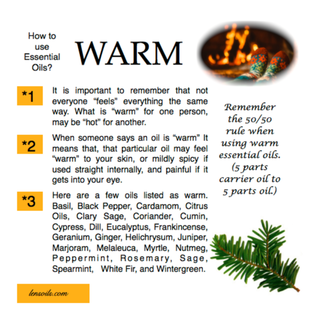 Essential oils can create a warming sensation on the skin, but it’s important to remember that everyone experiences this feeling differently. What may feel mildly warm to one person could feel hot or even irritating to another. When using essential oils classified as “warm,” caution should be taken, especially for those with sensitive skin. If an oil accidentally gets into the eyes or mucous membranes, it can cause discomfort or a burning sensation. Always use proper dilution methods to prevent adverse reactions.