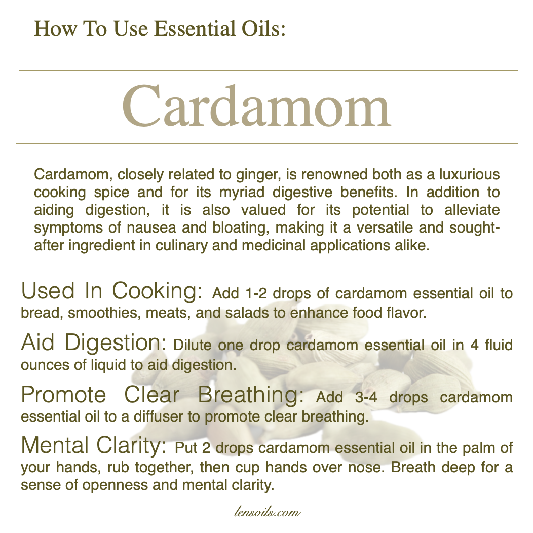 Beyond digestion, cardamom essential oil is often used in aromatherapy to promote respiratory health. Adding 3-4 drops to a diffuser can help create an atmosphere that supports clear breathing and soothes airways, making it useful during seasonal changes. Additionally, cardamom oil is said to promote mental clarity—placing 2 drops in the palms, rubbing hands together, and inhaling deeply is believed to provide a sense of openness and focus. Some studies suggest that certain compounds in cardamom may have calming effects, which could support mental well-being, though more clinical research is needed to determine its direct impact on stress reduction and cognitive function.