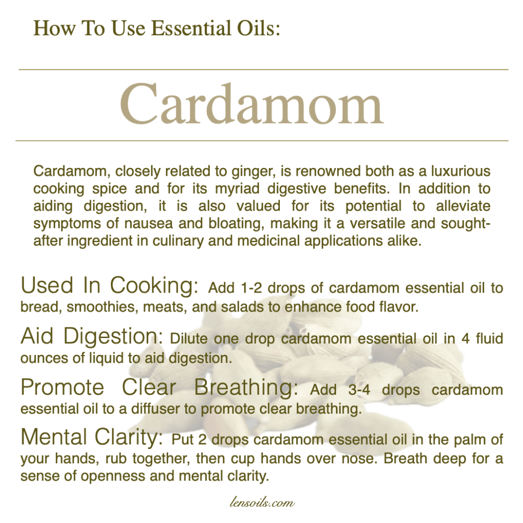 Rub hands together, cup near the face, Breathe in deeply, find mental space. Oh, cardamom oil, with gifts so true, For heart and soul, we turn to you.