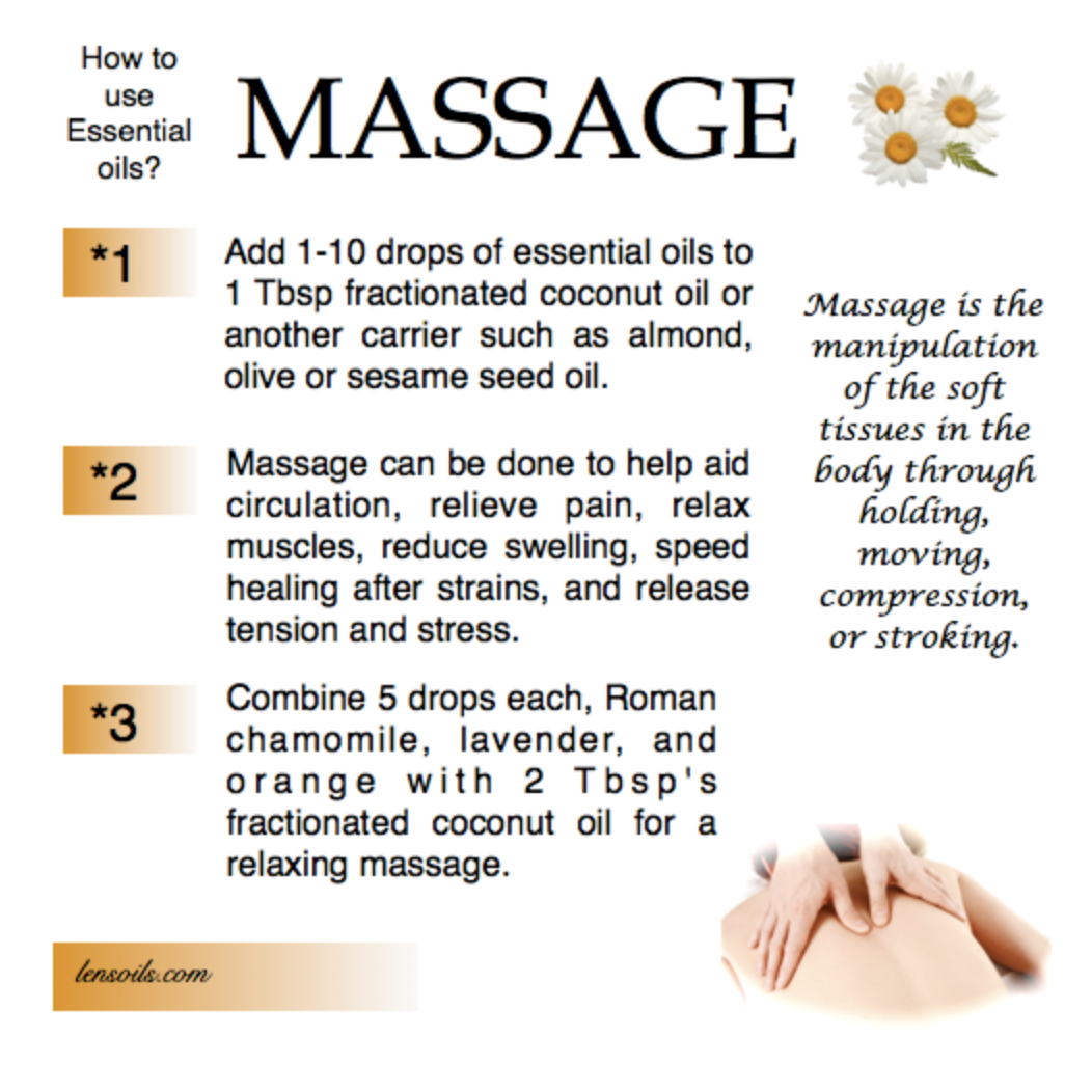 Massage is the manipulation of the body’s soft tissues through techniques such as holding, moving, compressing, or stroking. It can help improve circulation, relieve pain, relax muscles, reduce swelling, speed healing after strains, and release tension and stress. Essential oils can enhance the benefits of massage by adding therapeutic properties and soothing aromas. To use, dilute 1-10 drops of essential oil in 1 tablespoons of a carrier oil such as fractionated coconut, almond, olive, or sesame seed oil to ensure proper application and avoid skin irritation.