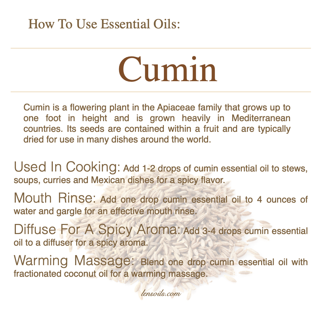 Beyond its culinary heritage, cumin essential oil is sometimes used to help promote relaxation after heavy meals or to ease occasional feelings of tension. When blended with citrus oils such as orange or lemon, it takes on a brighter, more refreshing quality, balancing its deep, spicy base. Properly diluted, cumin oil may also be added to massage blends to help comfort muscles and joints, though its potency means it is used sparingly. Its distinct aroma makes it a bold addition to both diffuser recipes and wellness routines.