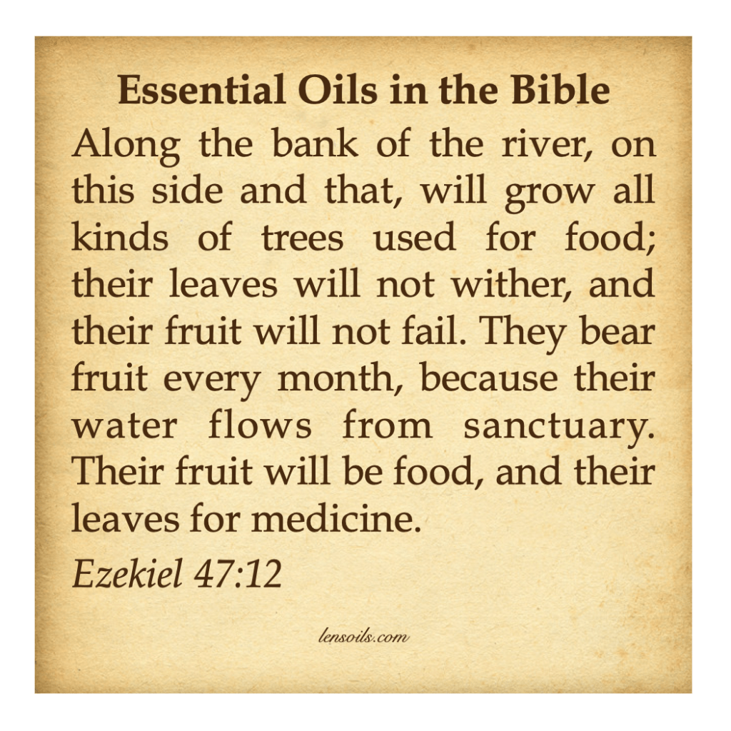 In Ezekiel 47:12, the prophet describes a vision of a life-giving river flowing from God’s temple, nourishing the land and producing trees that bear fruit for food and leaves for medicine. This passage reflects God’s provision for both physical nourishment and healing, emphasizing the natural gifts He has placed in creation. The leaves used for medicine suggest the historical use of plants and their extracts, including essential oils, in healing practices.
