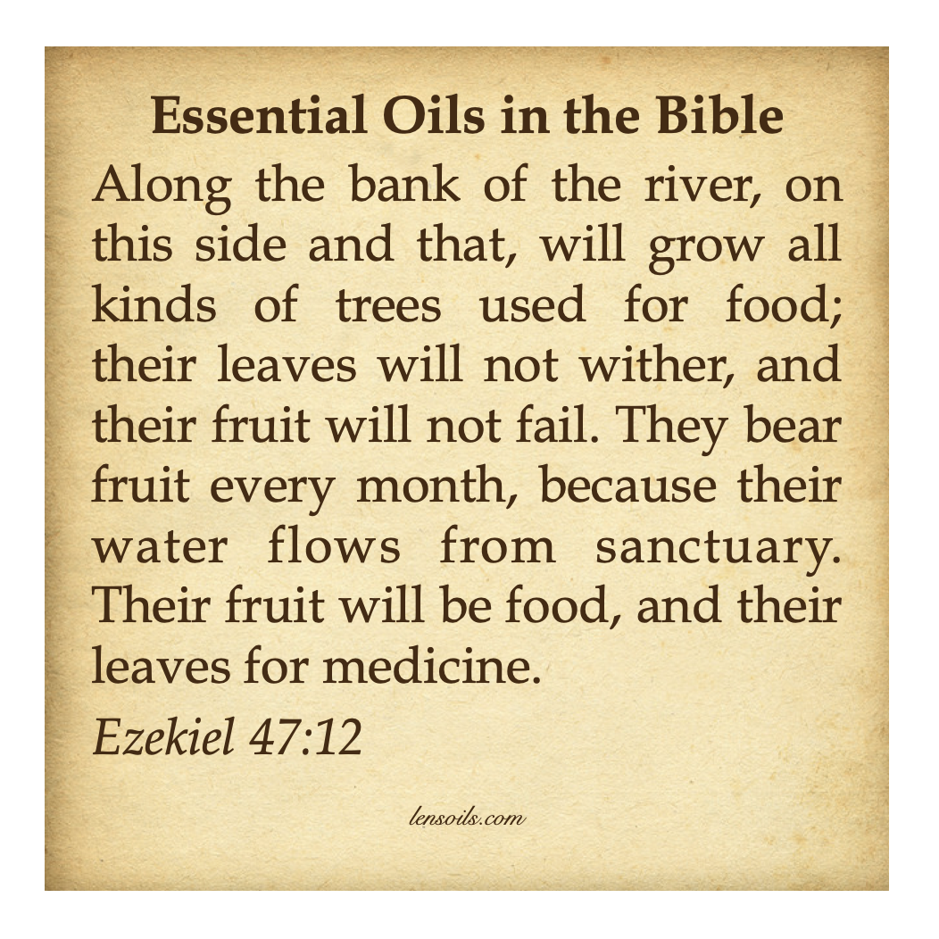 In Ezekiel 47:12, the prophet describes a vision of a life-giving river flowing from God’s temple, nourishing the land and producing trees that bear fruit for food and leaves for medicine. This passage reflects God’s provision for both physical nourishment and healing, emphasizing the natural gifts He has placed in creation. The leaves used for medicine suggest the historical use of plants and their extracts, including essential oils, in healing practices.