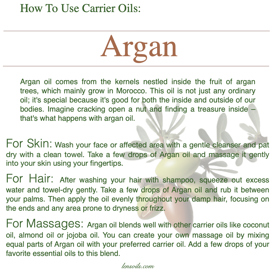 Argan Oil comes from the kernels nestled inside the fruit of argan trees, which mainly grow in Morocco. This oil is not just any ordinary oil; it’s a special carrier oil because it’s good for both the inside and outside of our bodies. Imagine cracking open a nut and finding a treasure inside—that’s what happens with argan oil.