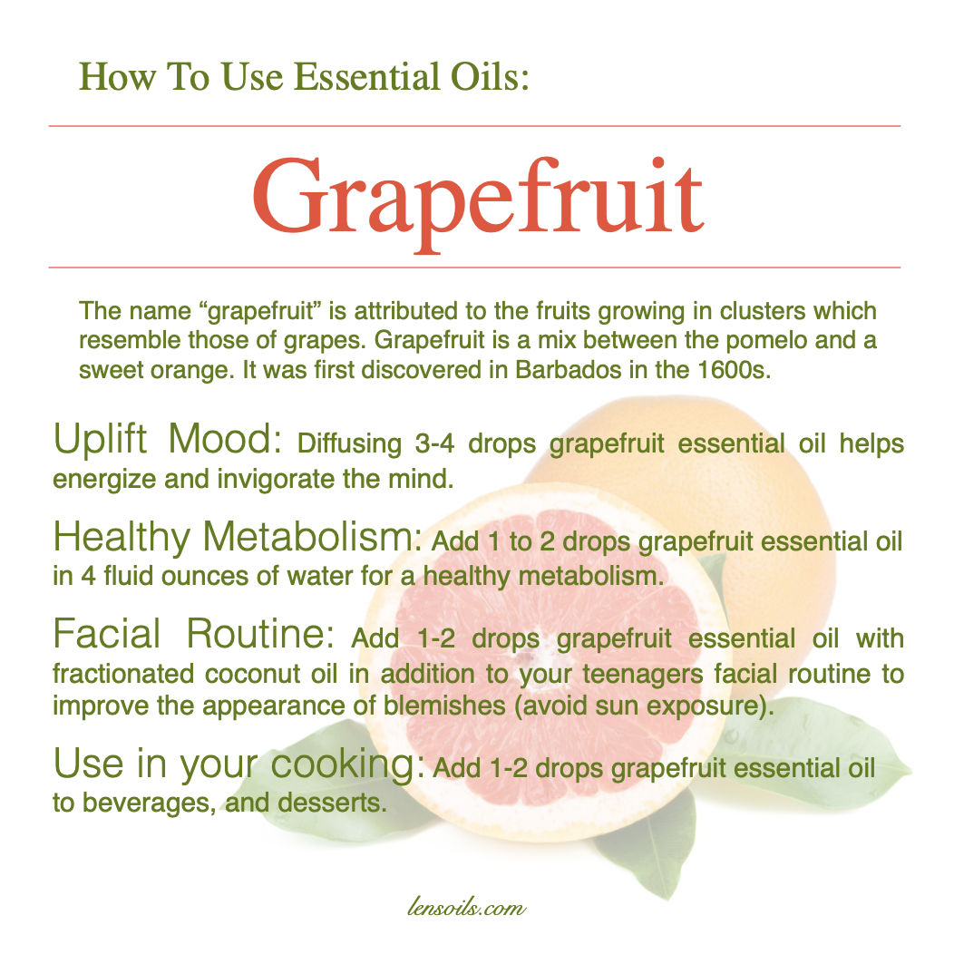 In daily routines, grapefruit essential oil is often used to support a healthy metabolism when a drop or two is added to water. When properly diluted with fractionated coconut oil, it can also be a gentle addition to a facial routine, especially for teenagers looking to improve the appearance of blemishes. Its crisp, tangy flavor makes it a favorite in the kitchen as well, where one or two drops can brighten beverages and desserts. Because grapefruit is photosensitive, topical use should always be followed by avoiding direct sun exposure.