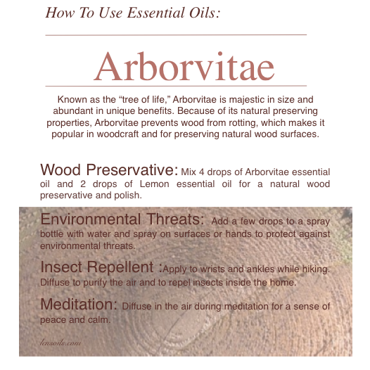 Arborvitae essential oil, derived from the “tree of life,” is known for its natural preserving properties and unique benefits. Traditionally used to prevent wood from rotting, this oil has been a popular choice for woodcraft and preserving natural surfaces. By mixing four drops of Arborvitae essential oil with two drops of lemon essential oil, you can create a natural wood preservative and polish, helping to protect and enhance the longevity of wooden furniture, countertops, and décor. Its ability to repel moisture and resist decay makes it a valuable tool for natural home maintenance.