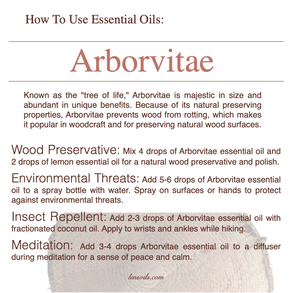 Beyond wood preservation, Arborvitae essential oil can be used to protect against environmental threats. Adding 5-6 drops of Arborvitae oil to a spray bottle filled with water creates a natural surface and hand spray, offering protection without the use of harsh chemicals. Additionally, its strong, earthy aroma makes it a powerful insect repellent. When mixed with fractionated coconut oil and applied to the wrists and ankles, Arborvitae oil can help ward off insects while hiking or spending time outdoors. These protective properties make it a great addition to natural wellness and household care routines.
