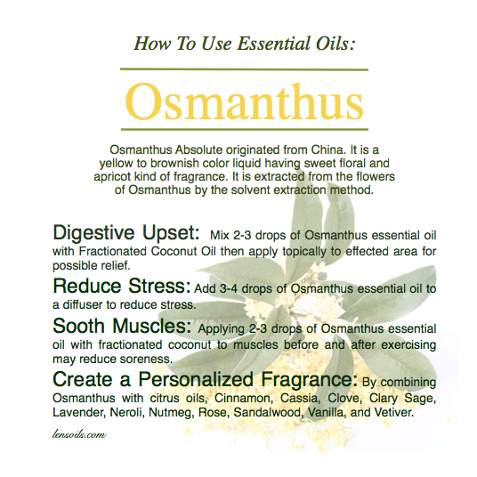 How to Use Essential Oils: Osmanthus November 18, 2021Better Living, Did You Know, Essential Oil Information, Essential Oil Quick FactsDid you know guy, Digestive Upset, Essential Oils, Fragrance, Osmanthus, Reduce Stress, Soothes Muscles, The did you know guylfish64 Osmanthus essential oil has a sweet floral and apricot kind of fragrance.