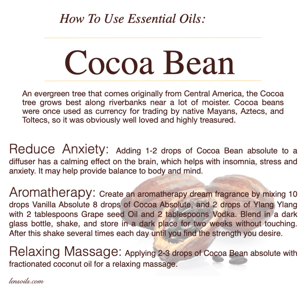 Beyond its delightful fragrance, cocoa essential oil is packed with natural compounds that contribute to its soothing and antioxidant qualities. It is sometimes used in skin-care blends for its nourishing properties, helping to support smooth, healthy-looking skin. In aromatherapy, cocoa’s rich scent can help ease stress, encourage relaxation, and even promote a more grounded emotional state. Its luxurious aroma makes it a favorite in romantic blends and self-care rituals.